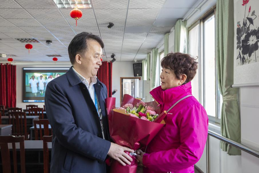 在离退休活动室,院领导为杨伯勋、郑兰香两位老领导送上鲜花,关心他们的身体和生活情况,感谢他们为医院发展倾注的心血,并叮嘱老领导们保重身体,继续关心、支持医院的发展,多提宝贵意见和建议。何庆南书记和江泓院长代表新一届班子承诺,将党政齐心,齐抓共管,共同推动湘雅三医院各项事业取得新进步。