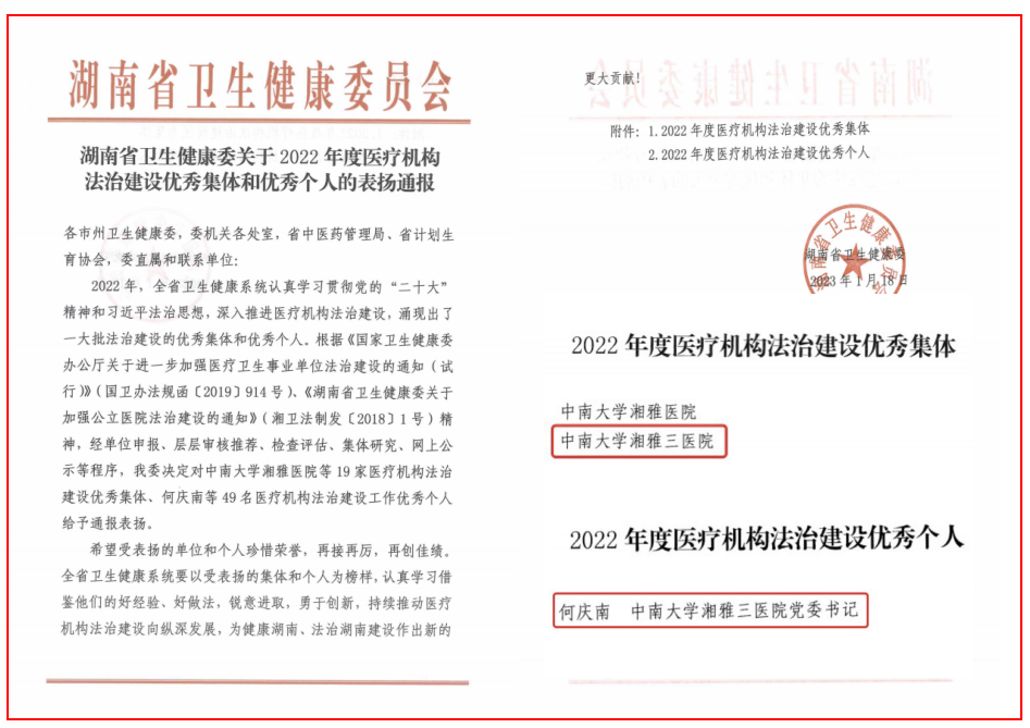 2023年1月,湖南省卫生健康委员会发布表扬通报,中南大学湘雅三医院荣获“湖南省2022年度医疗机构法治建设优秀集体”,医院党委书记何庆南荣获“湖南省2022年度医疗机构法治建设优秀个人”。至此,医院已连续三年荣获上述省级荣誉称号。