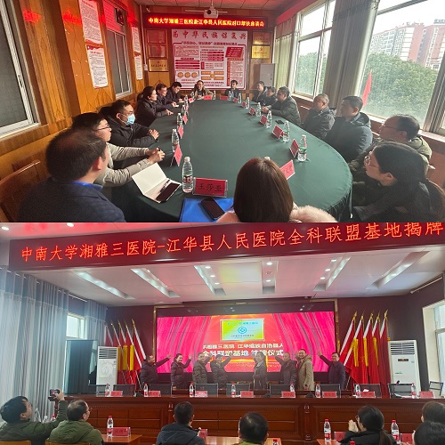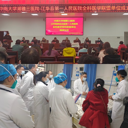 2月3日,医院在江华县人民医院成立全科联盟基地并举行揭牌仪式,江华县副县长熊丽丽、医务部副主任刘作良讲话,全科医学科主任范自力、毕业后医学教育办主任姚晨姣、江华县卫健局局长李双艳、中南大学驻江华乡村振兴工作队书记曹斌、江华县人民医院党委书记李昌江等出席揭牌仪式。随后,刘作良、范自力、周鹏程等专家以“全科医学概论”、“4.29事故医疗救治汇报”、“乙类乙管后的医院感染防控”为题开展学术讲座,姚晨姣、岑超群、周文娟、周细平、鲁安洁深入相关科室开展讲课、指导建设、教学查房等工作。
