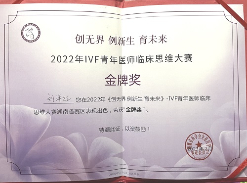 在随后的湖南省选拔赛中,来自湘雅医院、中信湘雅、长沙市妇幼保健院等中心选手激烈角逐。最终,湘雅三医院刘洋虹医师通过PPT课件演讲,对临床问题进行病例分析,并运用临床思维灵活思考、举一反三,多角度、多方向、多途径的阐述生殖前沿及热点话题,得到专家评委一致好评,在比赛中脱颖而出,以优异的成绩顺利晋级,获得IVF青年医师临床思维大赛湖南赛区金牌奖。