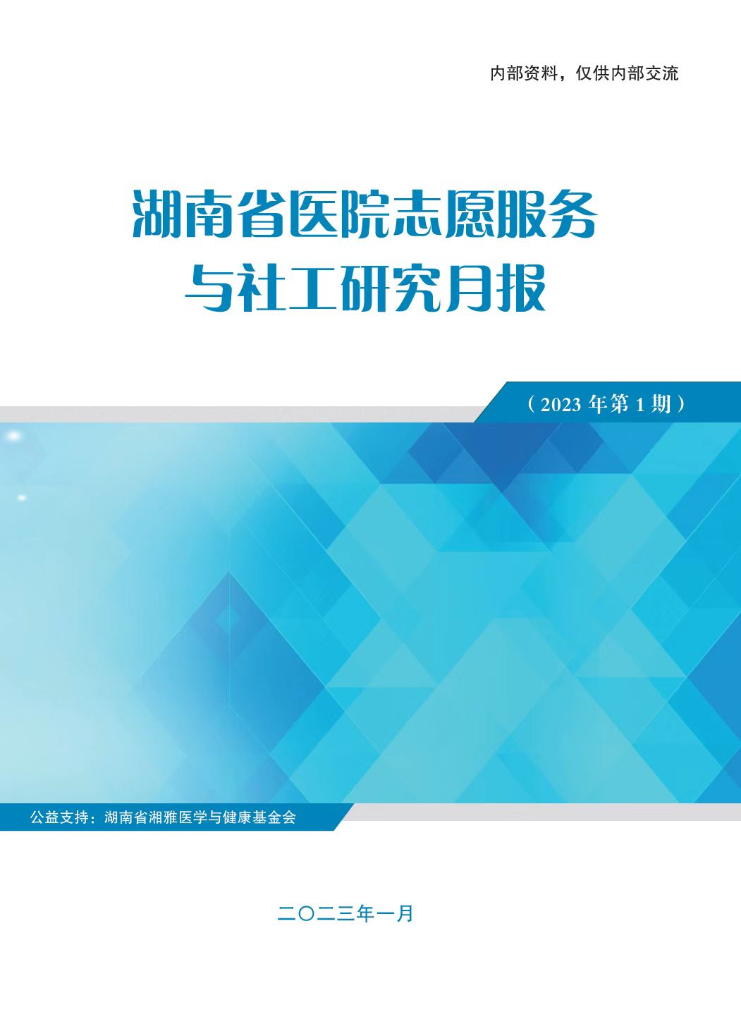 “社会工作风采”栏目中,以“‘健康之旅’摆渡人:中南大学湘雅三医院发挥医务社工专业优势 推进‘身-心-社-灵’全人全程病友关怀服务体系”为题介绍了新湘雅多方共建医务社工团队在医疗服务中注入专业实力、组织推力、真情温度、人文厚度和共赢智慧,共护病友康复之路、共铺爱心传递之路、共筑医患和谐之路、共建家属支持之路、共创品牌发展之路的医务社工发展模式及其成效。“志愿服务风采”栏目则介绍了“生命之树”守护者——中南大学湘雅三医院爱心“1+1”健康直通车卫健志愿服务品牌项目的工作内容、保障机制、实施情况、创新之处和社会反响等。此外,“志愿服务典型项目”栏目刊载了杨华以“开辟社区新‘战场’老年志愿服务谱新篇”为题总结的医院老年志愿服务创新思路、具体做法、工作成效和主要特色。“个案分享”与“小组活动”栏目中,谷芊利等分享了“医务社工以‘病房陪伴’体现人文关怀的实务案例”,罗咸宁等介绍了“‘打败情绪小怪兽’——游戏治疗介入白血病患儿情绪支持小组”实务案例。