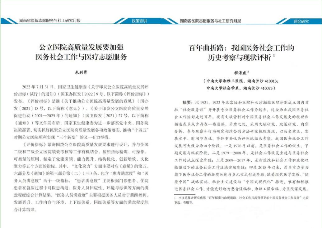 在“政策宣讲”部分,朱利勇结合国家政策文件深入浅出地阐释了公立医院高质量发展过程中加强医务社会工作与医疗志愿服务的必要性和重要性,他指出:国家《关于推动公立医院高质量发展的意见》(国办发〔2021〕18号)《关于印发公立医院高质量发展促进行动(2021-2025年)的通知》(国卫医发〔2021〕27号)等政策文件对公立医院开展公益慈善和社工、志愿者服务提出了要求,开展医务社会工作与医疗志愿服务活动,既是推进医院高质量发展的重要举措,亦有利于弥补生物医学模式的缺陷,提高医疗服务质量,有利于改善患者就医感受,提升医院公众口碑。在“理论研究”栏目,程海威以“百年曲折路:我国医务社会工作的历史考察与现状评析”为题发表理论文章,以历史意义、发展水平、时间节点性、事件重要性为评判依据来考察,对我国医务社会工作的发展进行了总结与评析,并提出:唯有抓住战略机遇期,将借鉴国际经验和解决本土问题、理论研究和实务开展结合起来,形成有特色、有品质、有实效的医务社会工作运行体系,才能适应中国式现代化的发展进程与中国特色社会工作的发展趋势。