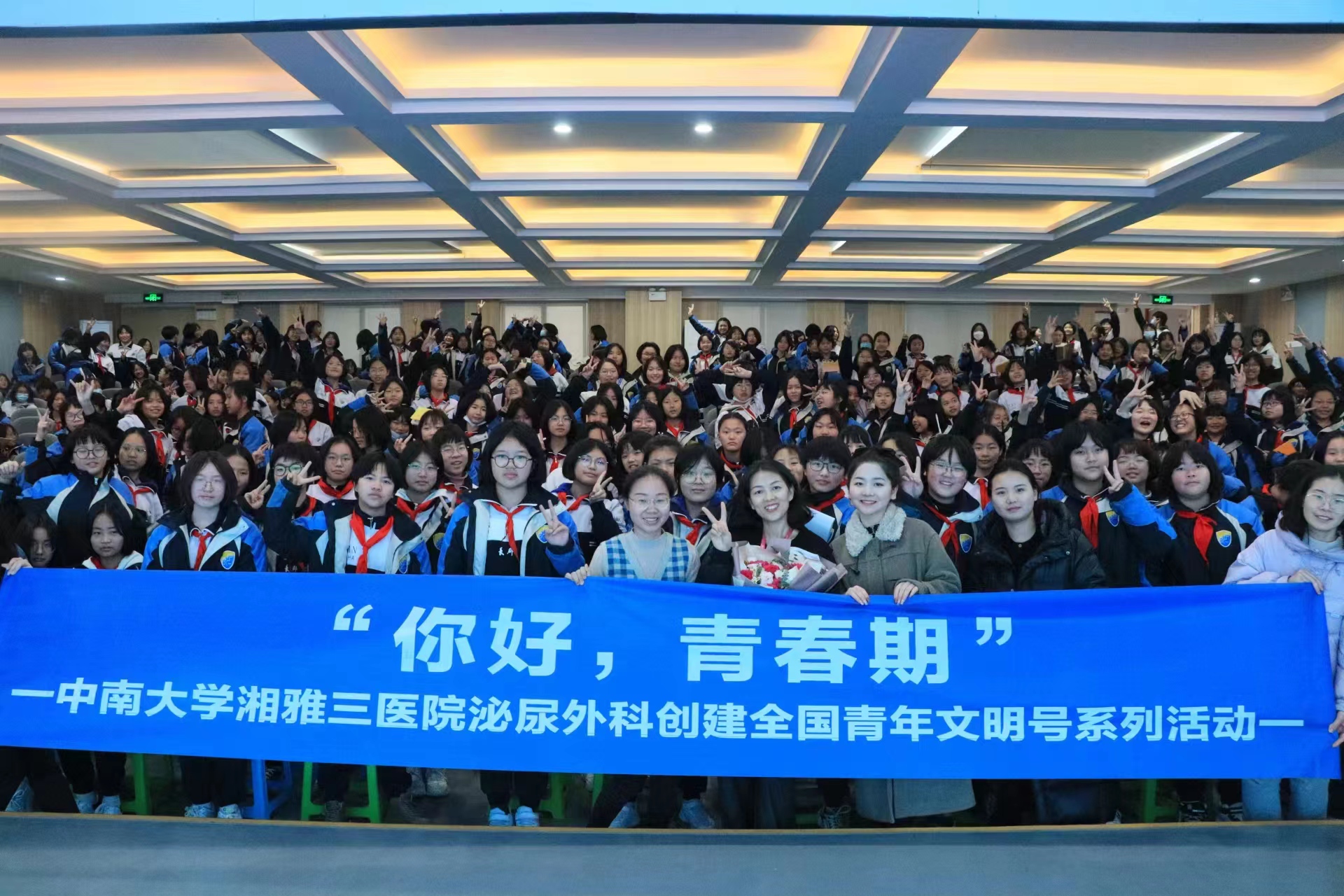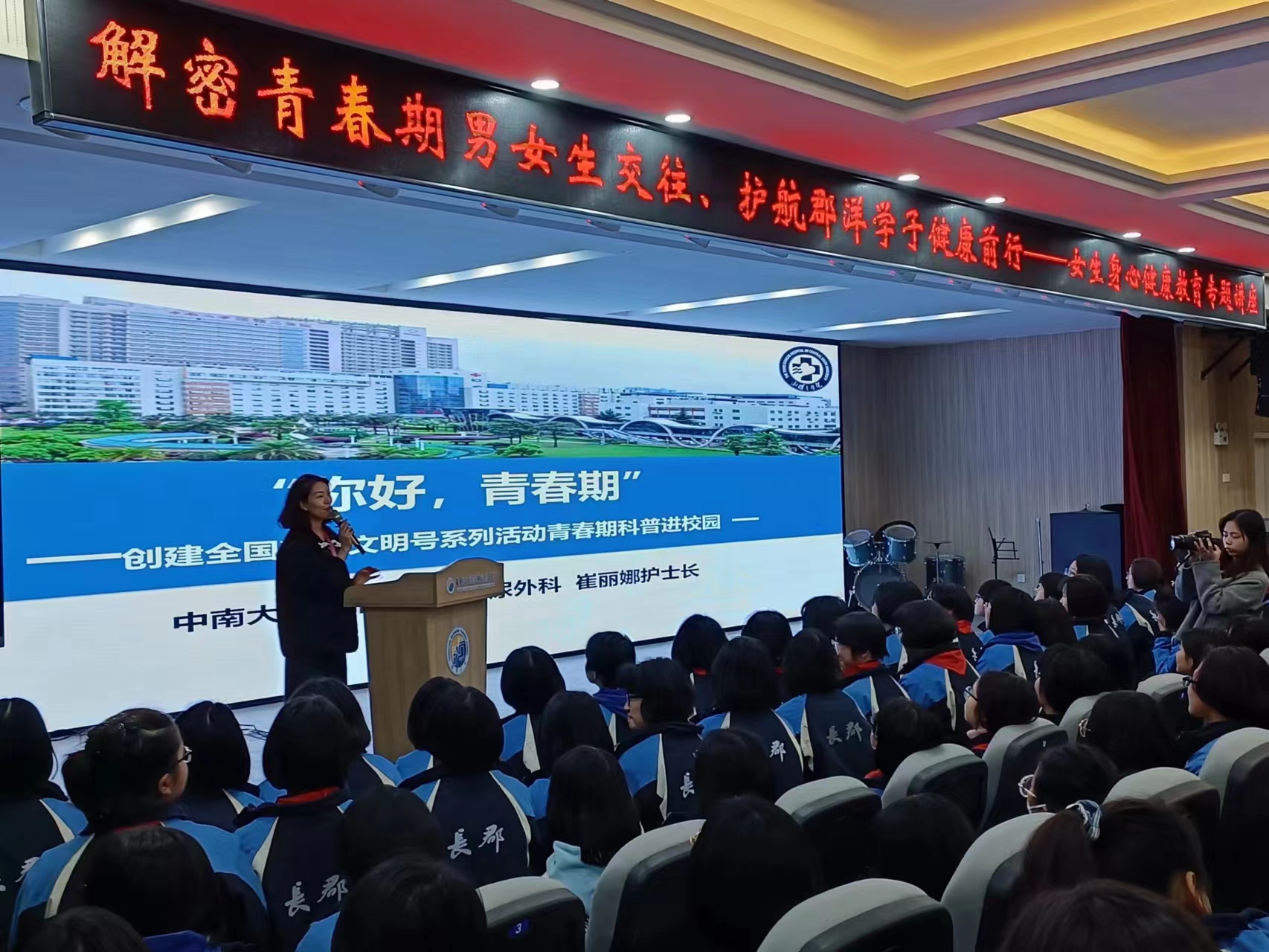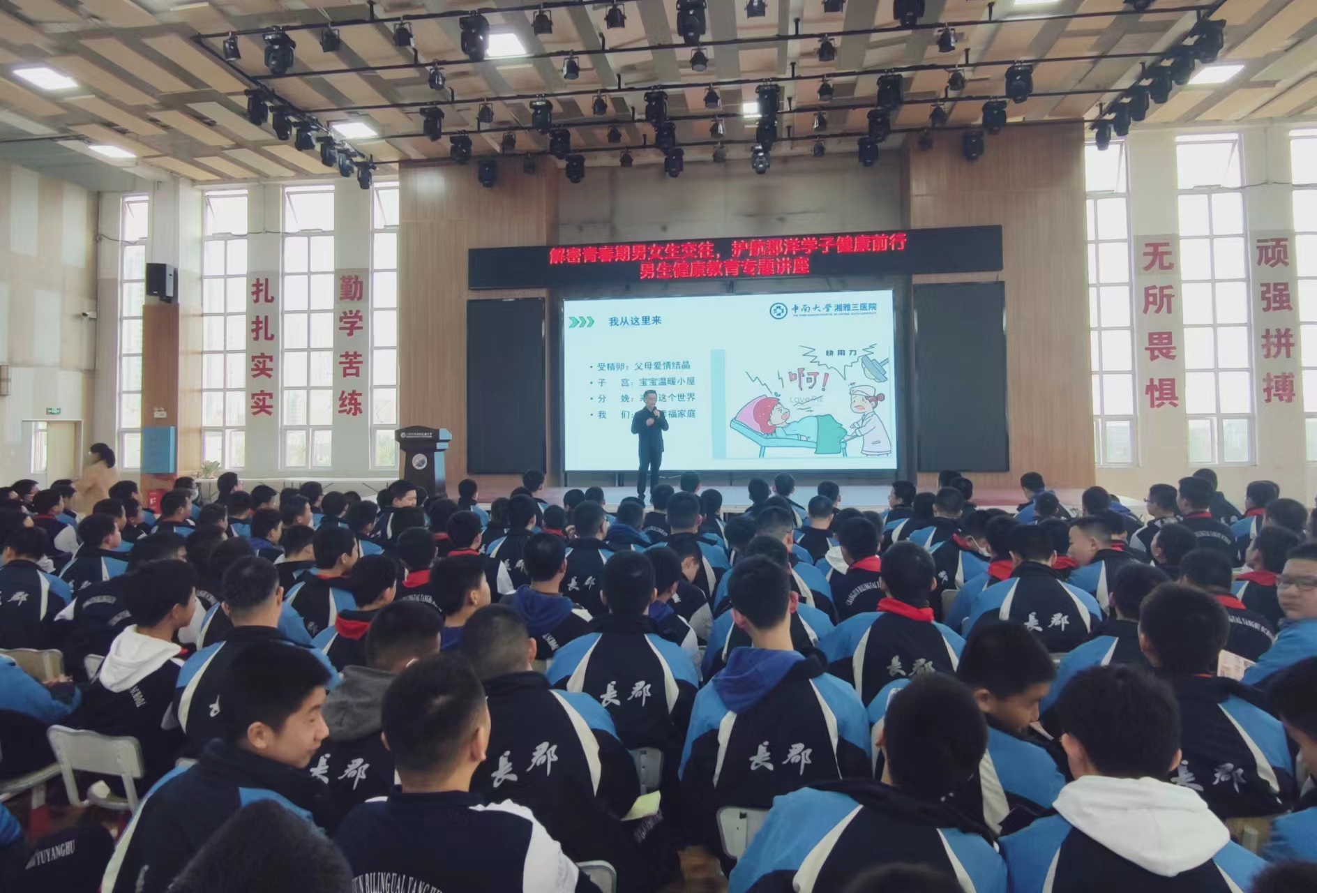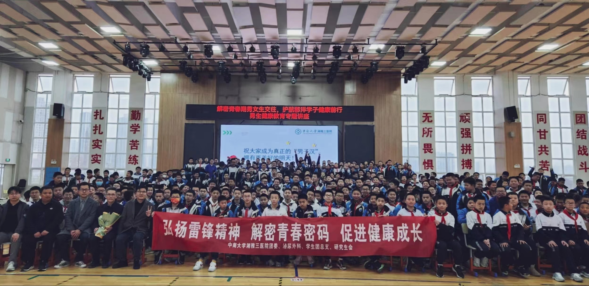 为贯彻落实《健康中国2030规划纲要》,弘扬雷锋精神,提高青少年学生青春期保健意识,2月28日下午,中南大学湘雅三医院泌尿外科联合院团委、学生团总支及研究生会在长郡双语洋湖实验中学举行“解密青春期男女生交往、护航郡洋学子健康前行”健康科普主题活动。泌尿外科男性病中心主任龙智、29病区护士长崔丽娜分别在男女专场,为学生们进行了专题讲座,泌尿外科主管护师刘丹,院团委学生兼职副书记、研究生会主席舒玉锋,研究生会宣传部副部长张佳琪等4名团学干部及全校1000余名学生参加了本次健康教育活动。