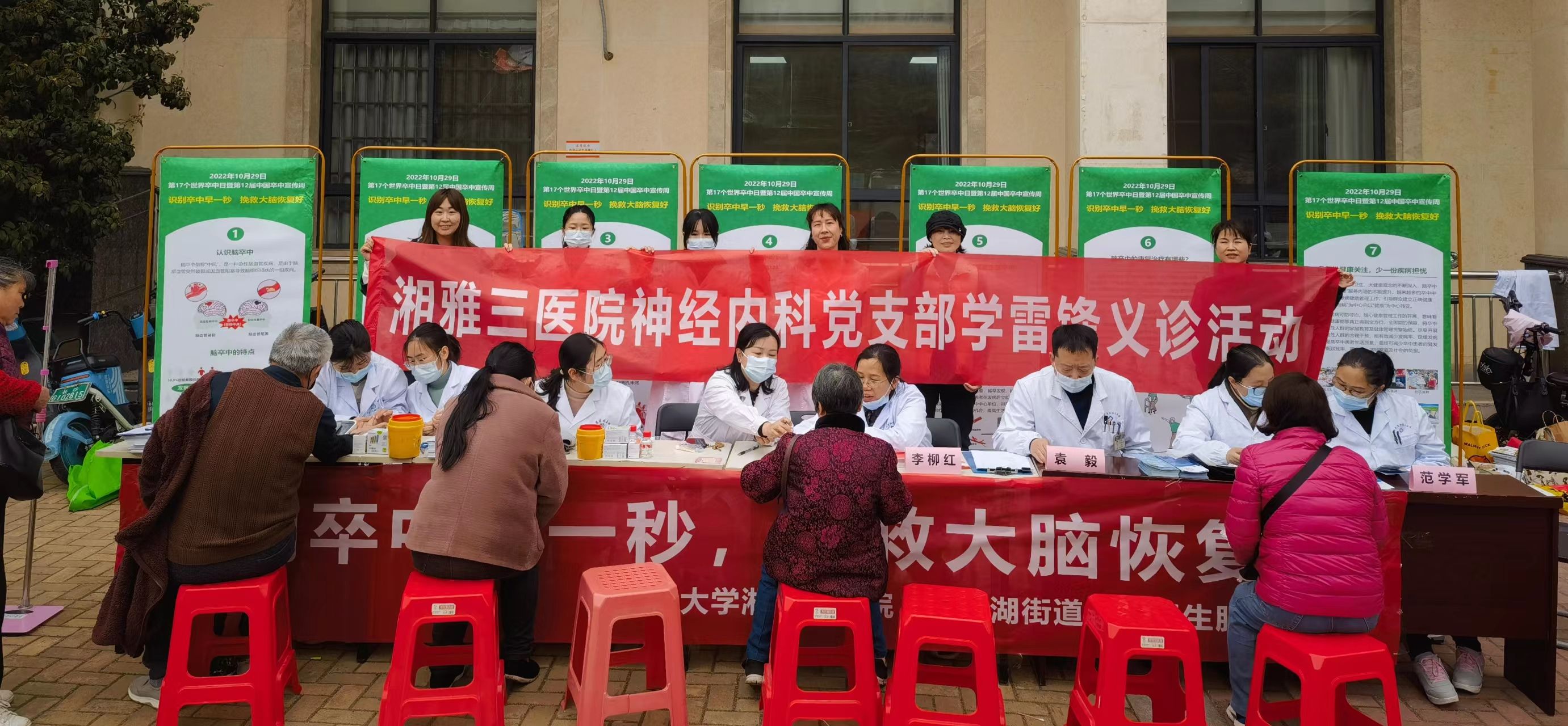 每年的3月5日为学雷锋纪念日。3月4日上午9点,中南大学湘雅三医院神经内科党支部为践行“向雷锋同志学习”,在范学军、袁毅教授的带领下10余名医务人员携手长沙市咸嘉湖街道社区卫生服务中心一起为社区居民进行卒中高危筛查义诊宣教活动。