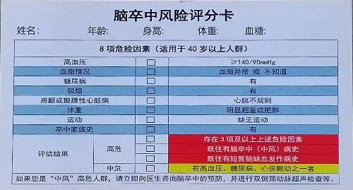 义诊现场,神经内科党支部及社区卫生服务中心的医务人员免费为居民测血压、血糖、称体重量身高、计算BMI,根据脑卒中“8+2”危险评分卡进行评估与筛查。