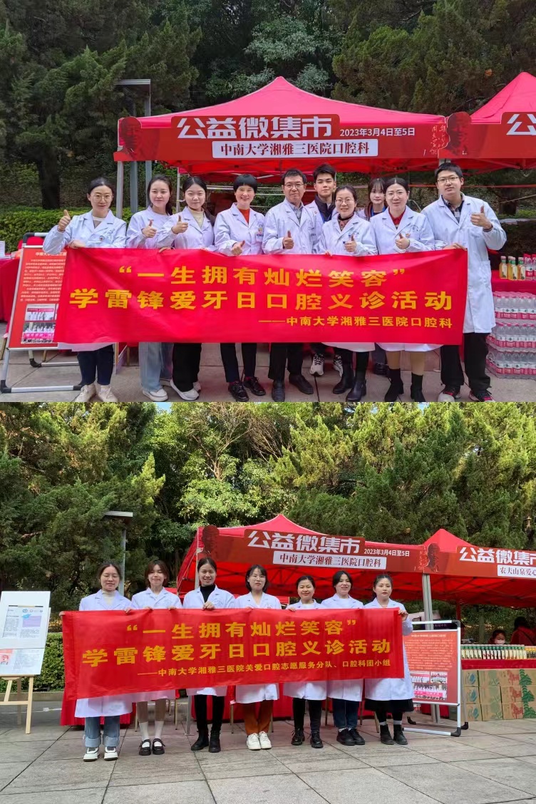 3月4日至3月5日,中南大学湘雅三医院口腔科积极响应院党委、团委的号召,作为唯一一家医院受邀参与“学雷锋精神 担复兴大任 做时代新人”,纪念毛泽东等老一辈革命家为雷锋同志题词60周年主题活动,结合公益微集市,在湖南烈士公园开展“一生拥有灿烂笑容”口腔义诊活动。