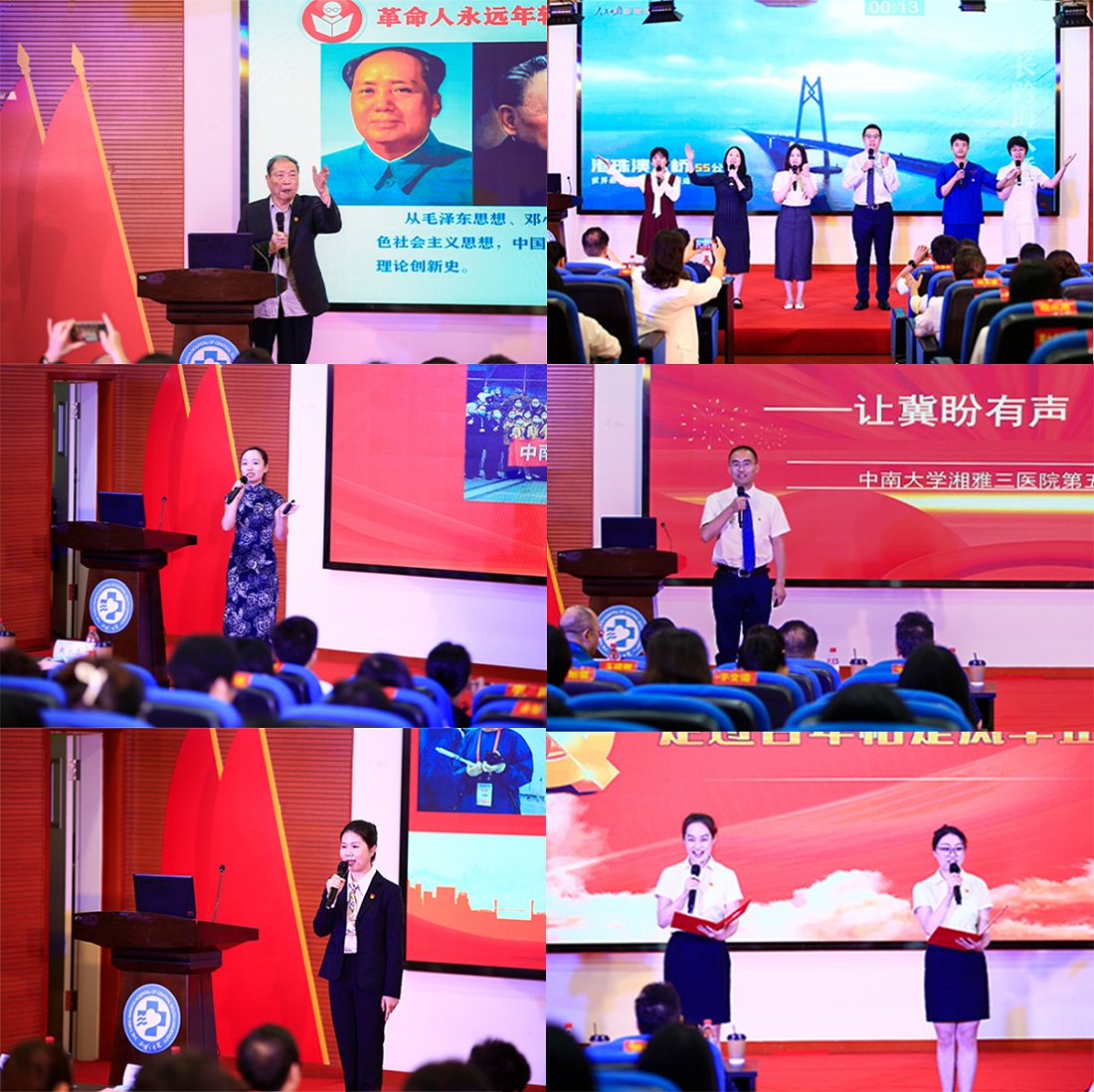 当85岁还在住院的刘浔阳老院长带着留置针走上讲台的那一刻,全场肃然起敬,响起热烈的掌声。他以“革命人永远是年轻”为题,从理论创新、方向选择和“舍得精神”三个方面讲述了新湘雅老党员们的永葆青春、初心不变的答案,他用慷慨激昂的语调讲述着新湘雅老党员们的坚守与当担,引起全场观众的共情和感动。