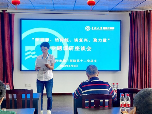 党总支副书记、离退休办主任屈俊珍负责主持“学思想、话传统、谈复兴、聚力量”专题调研座会,听取离退休党员对中国特色社会主义新时代发展变化的真实看法、真切感受、真心认同,广泛听取老同志的心声和意见建议。杨伯勋、刘浔阳、郑兰香、巫爱琳、沈守荣、周昌菊、石光清、刘亚洲等老党员纷纷发言。他们都认为,医院离退休党员在党委领导下,非常受鼓舞,不断在进步,越活越年轻,纷纷表示,有能力就一定积极参加党总支组织的各类活动,有一份热发一份光,有一份劲就出一份力,让先进基层党组织这把火越烧越旺。