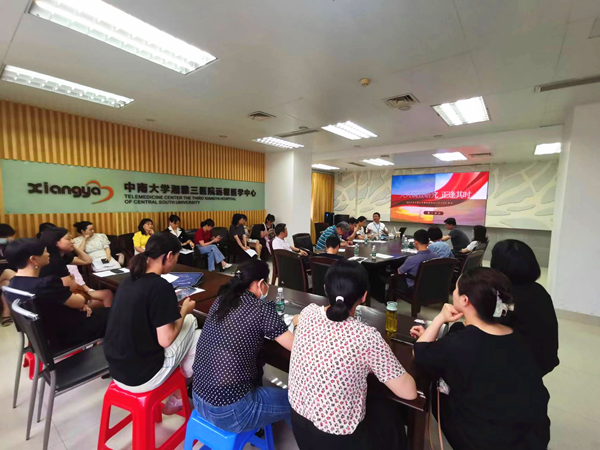 6月8日下午,中南大学湘雅三医院第三党总支组织各支部书记、支委委员、党小组长、科室主任及护士长在外科楼二楼远程会议室,开展学习贯彻习近平新时代中国特色社会主义思想主题教育专题党课和“金点子”讨论会。党委副书记杨飞龙讲党课,第三党总支书记朱锐主持会议。