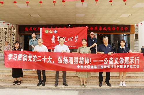 6月9日,为响应党和国家“推动优质医疗资源扩容下沉和区域均衡布局”的两会新要求,中南大学湘雅三医院第五党总支脊柱外科康复科党支部联合郴州市嘉禾县人民医院开展健康公益义诊活动。此次义诊活动由脊柱外科邓幼文主任带领,臧晓方教授、彭耀庆教授、周嘉辉副教授及杨驰护士长、陈艳萍主管护师、熊俊主管护师团队积极参加。希望通过此次活动将优质的医疗服务送到基层,促进城乡振兴、推动健康湖南发展。
