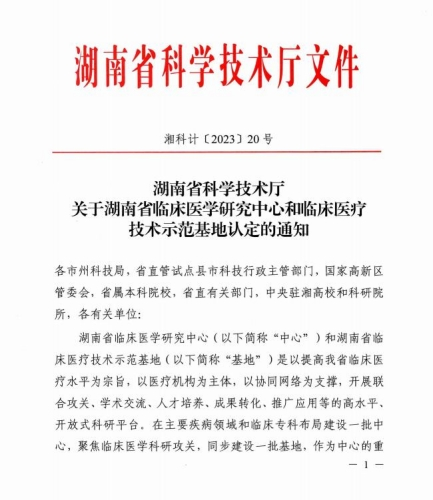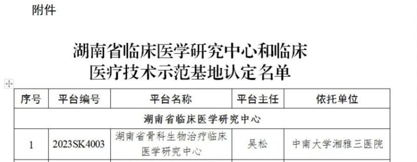 近日,湖南省科学技术厅发布了“湖南省科学技术厅关于湖南省临床医学研究中心和临床医疗技术示范基地认定的通知”[湘科计〔2023〕20号],湘雅三医院骨科获批建设“湖南省骨科生物治疗临床医学研究中心”(平台编号:2023SK4003)。该研究中心以湘雅三医院牵头、中国科学院基础医学与肿瘤研究所及间充质干细胞湖南省工程研究中心协同建设,吴松教授担任平台主任,罗令、沈民仁、赵明、李志远、曹旭担任平台副主任。该中心的成立代表着湘雅三医院骨科在生物治疗领域跨上了一个新的高度,同时填补了我国在骨关节疾病生物治疗领域的不足。