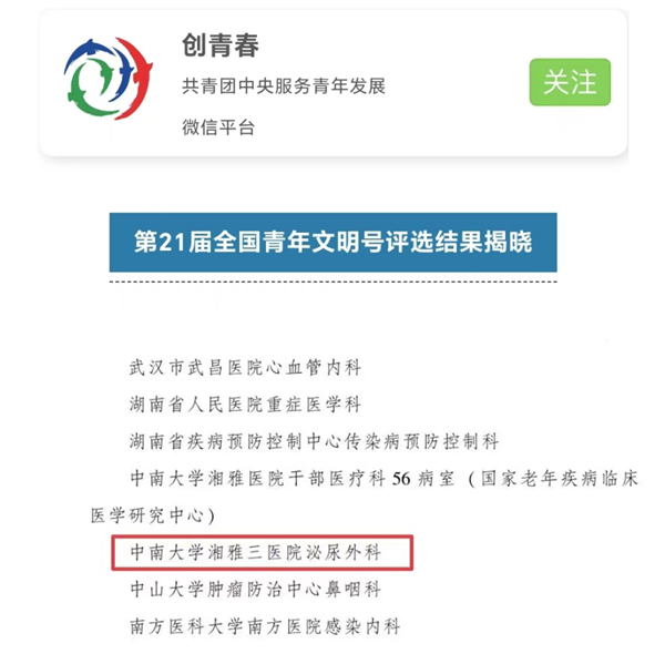 青年文明号创建活动是改革开放以来我国青年运动史上的重要工作品牌。全国青年文明号每两年评选一次,被命名的集体是各行各业先进青年集体的典型代表,具有过硬的政治素质、高尚的职业道德、高超的职业技能、优良的工作作风和突出的岗位业绩。本次中南大学湘雅三医院泌尿外科斩获该项荣誉,是医院党委领导青年集体奋勇建功,在推动行业发展、促进青年成长、弘扬文明风尚方面取得显著成果的又一明证。泌尿外科主任王龙表示,青年文明号是使命、是责任、是担当、是奉献,科室将以获评全国青年文明号为新契机,向新征程出发,创造新业绩,谱写新篇章,为强国建设、行业进步、医院发展贡献更大力量。