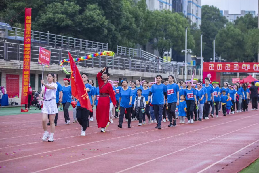 在欢快的音乐节奏中,裁判李刚带领全场领导、嘉宾、运动员开展了热身运动,随后运动会各项目依次展开。本次运动会由医院工会主办,共有10个大项,19个单项,101场次的比赛。包含100 米、1000 米、立定跳远、实心球、飞盘九宫格等竞技项目,4×100 米、4×400 米等男女混合接力项目,智勇大冲关、飞盘比赛、守护健康、医路相伴、新湘雅速度等团体趣味项目,以及家庭折返接力赛、幸福向前冲、勇攀高峰、携手同行等亲子项目。整个竞赛过程充分体现了广大职工良好的精神状态,运动员勇于挑战、顽强拼搏,展现了健康向上的体育精神,裁判员公平公正体现出了高超专业的裁判水准,工作人员辛劳付出、默默奉献,保障了各项赛事顺利进行。