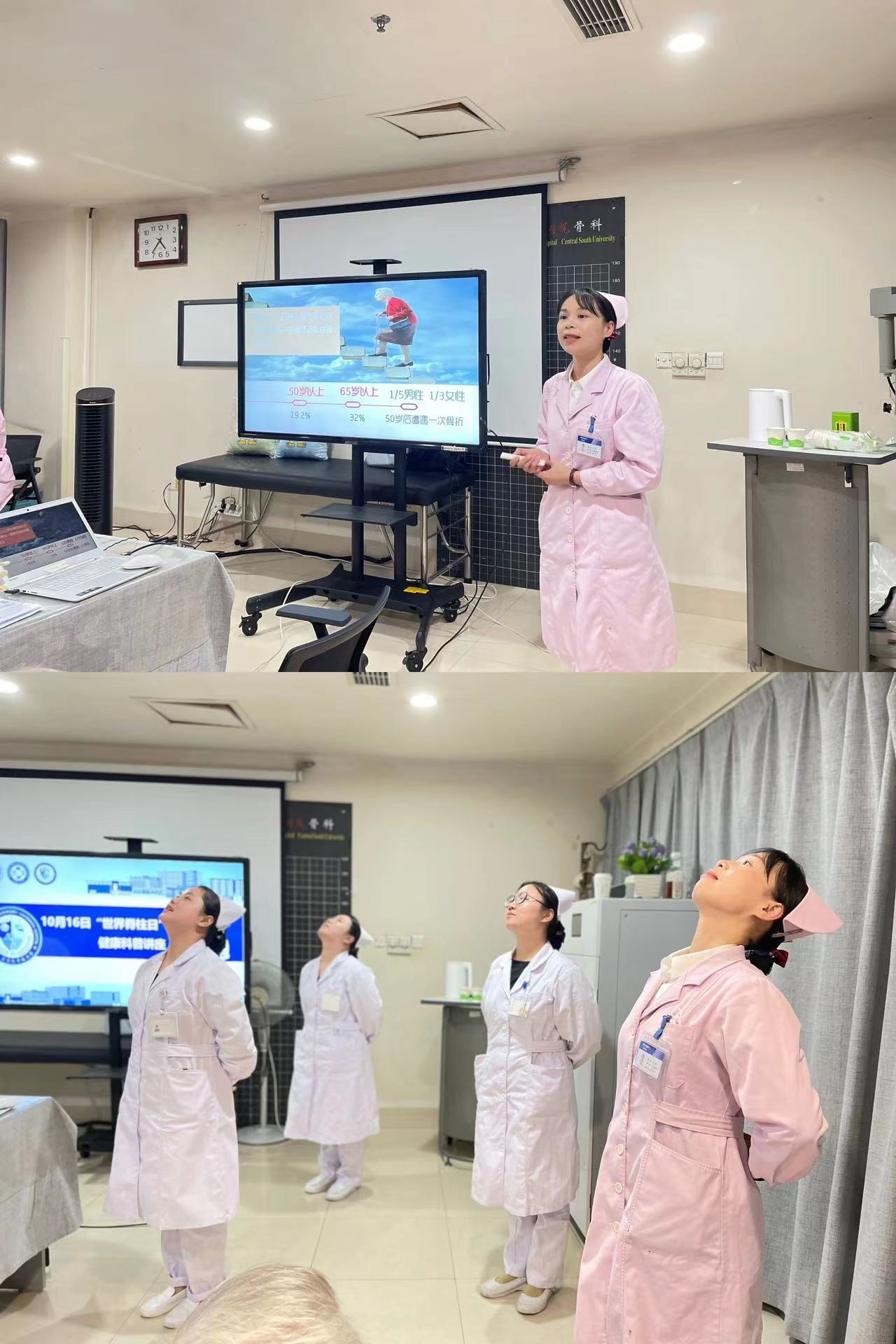 此外,脊柱外科主管护师王莹以《脊心柱力,远离骨折》为主题,通过举实例以及带领实习生们现场演示等多种方式,由浅入深、生动形象的介绍了骨质疏松性骨折的治疗方案及预防措施、跌倒的预防及健骨操等,她也结合自身的专业与经验,给出切实、合理的建议,许多病友们均表示此次活动受益匪浅。