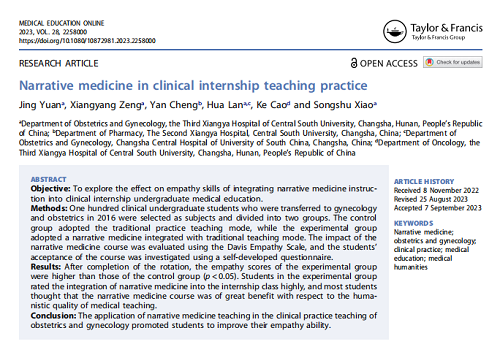 近日,中南大学第三临床学院曹科、肖松舒教授团队在医学教育顶刊《MEDICAL EDUCATION ONLINE》(2022 IF=6,Q1)在线发表高水平原创性教学论著“Narrative medicine in clinical internship teaching practice”。曹科、肖松舒教授为并列通讯作者,博士研究生袁静为第一作者,中南大学湘雅三医院为独立通讯单位。