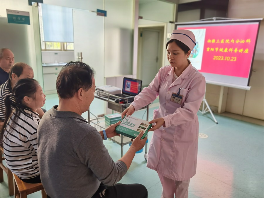 下午三时活动开始,老年糖友齐聚一堂。护士长龙飞艳、李霞代表科室医护人员向老年糖友献上节日的祝福和关怀,并为每位病友送上“1日控糖主食包”及糖尿病健康宣教资料。