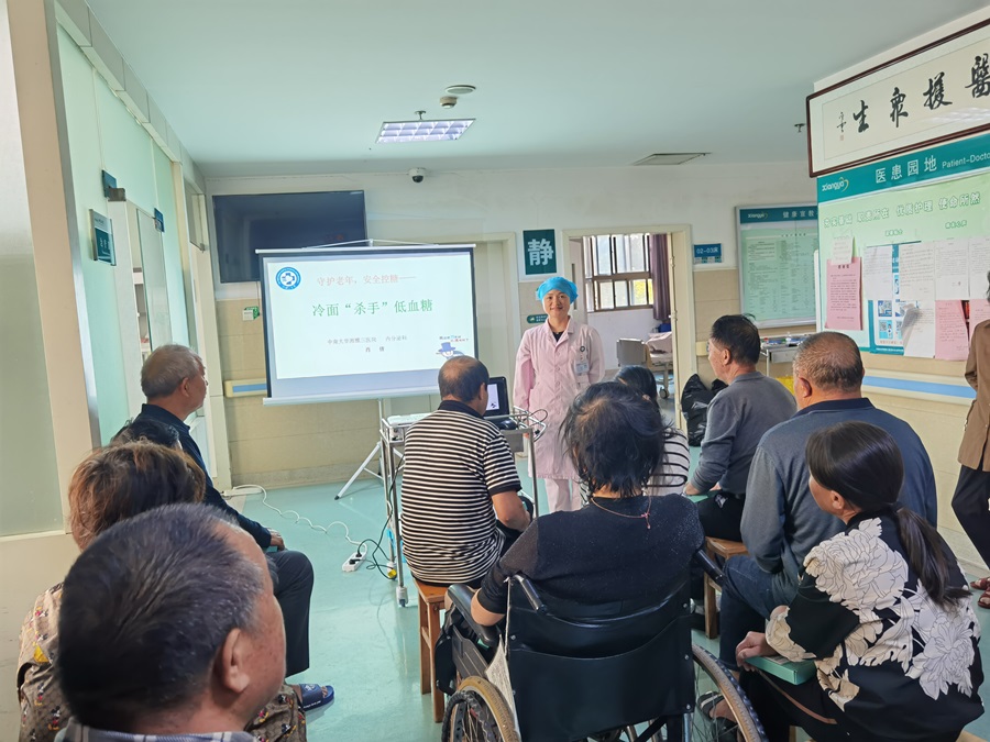 随后,内分泌科资深糖尿病专科护士、国际伤口治疗师肖倩主管护师为患者们带来主题为《守护老年,安全控糖——老年低血糖防治》的专题健康讲座。她结合丰富的临床经验,从老年糖尿病患者如何正确认识低血糖、发生低血糖的诱因、如何预防和处置低血糖三方面进行生动讲解。为加深印象,她和患者一起进行现场互动有奖问答,并用一首原创打油诗进行总结:“低血糖来3.9,饥饿心慌手发抖;测糖补糖双15,科学防治有力度,杀手也成纸老虎。”