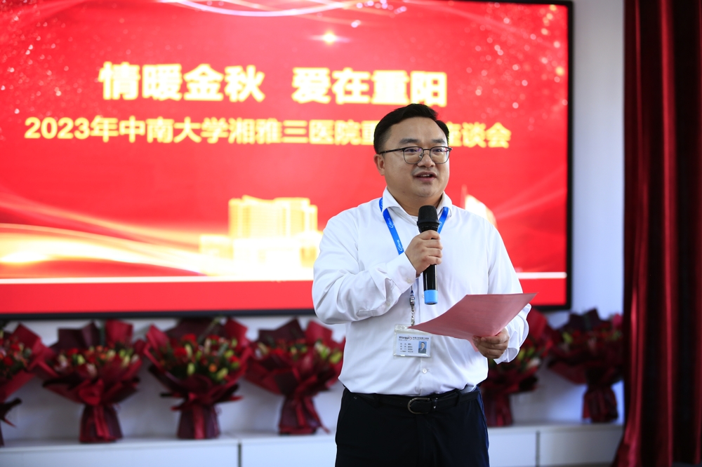 金秋十月,丹桂飘香。10月23日下午,在一年一度的九九重阳节到来之际,中南大学湘雅三医院2023年离退休人员重阳节座谈会在离退休人员活动室举行。院领导何庆南、江泓、杨飞龙、张劲强、费云、朱利勇、左笑丛、曹科以及相关职能部门负责人、青年教师代表、学生代表与退休的老领导、老同志欢聚一堂,共叙情谊,同庆佳节。座谈会由副院长曹科和教务部主任庄权、离退休办公室副主任杨梦卿先后主持。