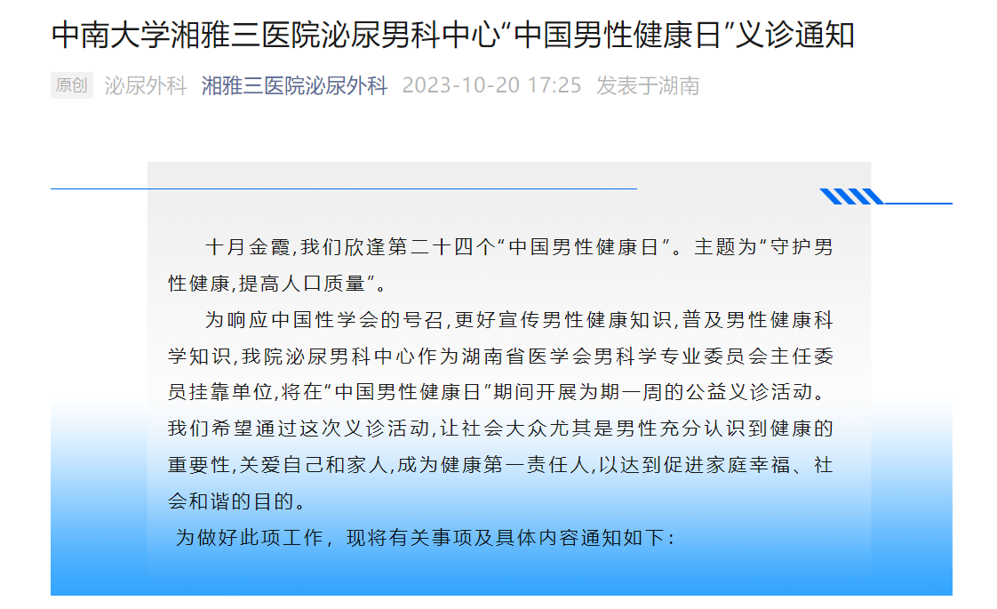 2023年10月28日是第24个中国男性健康日,中国性学会确定本年度“中国男性健康日”活动主题为“守护男性健康,提高人口质量”。 为积极响应中国性学会的号召,更好宣传男性健康知识,普及男性健康科学, 中南大学湘雅三医院泌尿男科中心作为湖南省医学会男科学专业委员会主任委员挂靠单位, 在“中国男性健康日”期间精心策划开展了为期一周的系列公益活动。