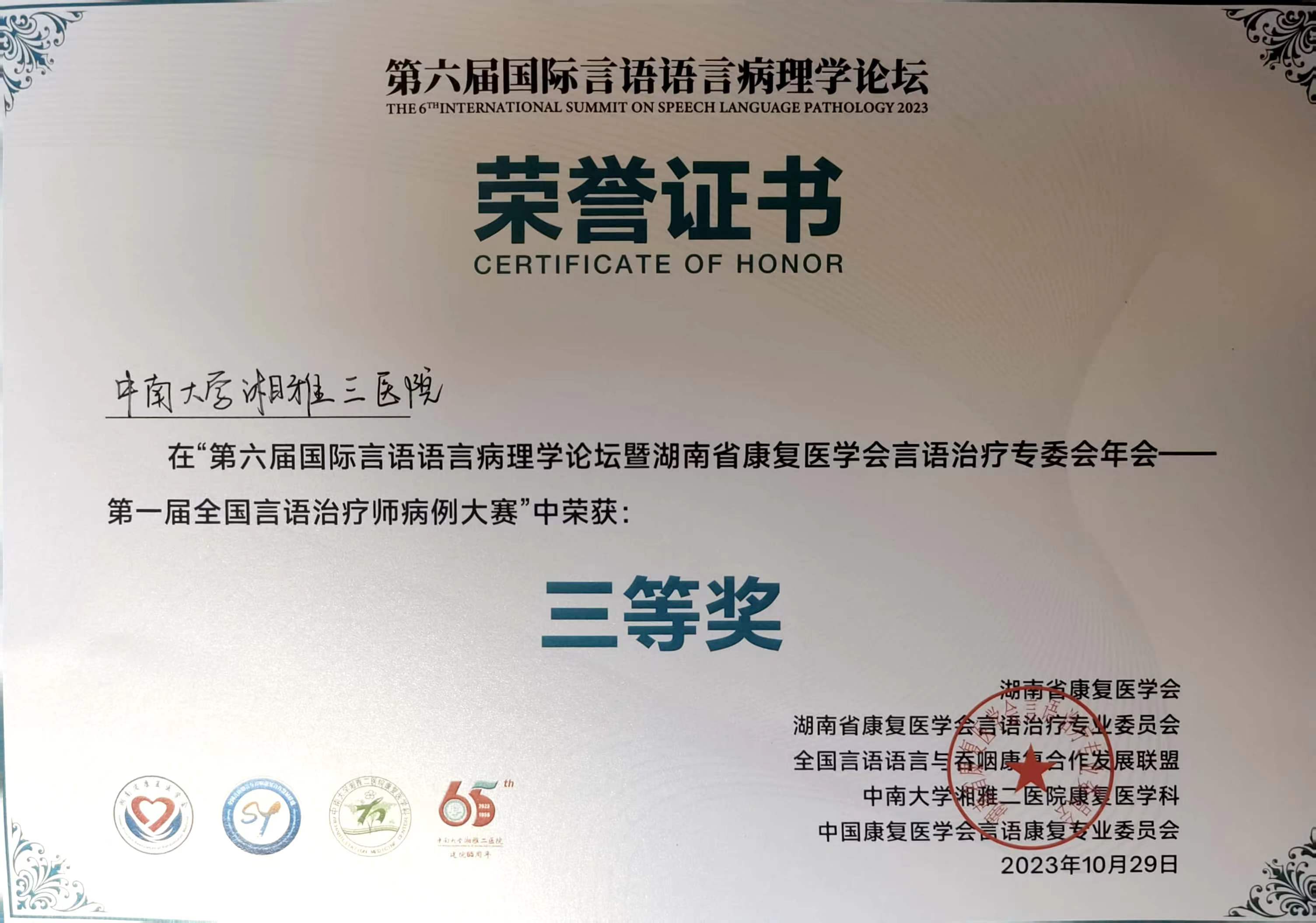 第一届全国言语治疗师病例大赛于2023年10月27日在湖南长沙举行。本次大赛由湖南省康复医学会主办,湖南省康复医学会言语治疗专业委员会承办,全国言语语言与吞咽康复合作发展联盟、中南大学湘雅二医院康复医学科、中国康复医学会言语康复专业委员会协办。中南大学湘雅三医院儿科医师田朗、主管护师罗伟伟组成的康复团队在全国12支团队中表现突出,荣获三等奖。