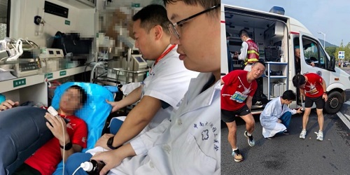 当天上午9时许,对讲机传来一名跑者突然出现严重呼吸困难的信息。ECMO团队立即响应,飞速赶到事发地。患者脸色惨白,明显呼吸困难。团队立即进行急救处置,确定患者无ECMO指征后,迅速护送患者到就近的医院进一步治疗。刚交接完,对讲机又传来一名参赛选手出现心跳骤停、可能需要ECMO支持的信息。团队再次出击,火速赶往事发点。庆幸的是,经过现场医务人员急救,患者已经复苏成功。为防止患者再次发生意外,急救指挥中心指定ECMO团队再次查看患者,并将其护送到医院进一步诊疗。