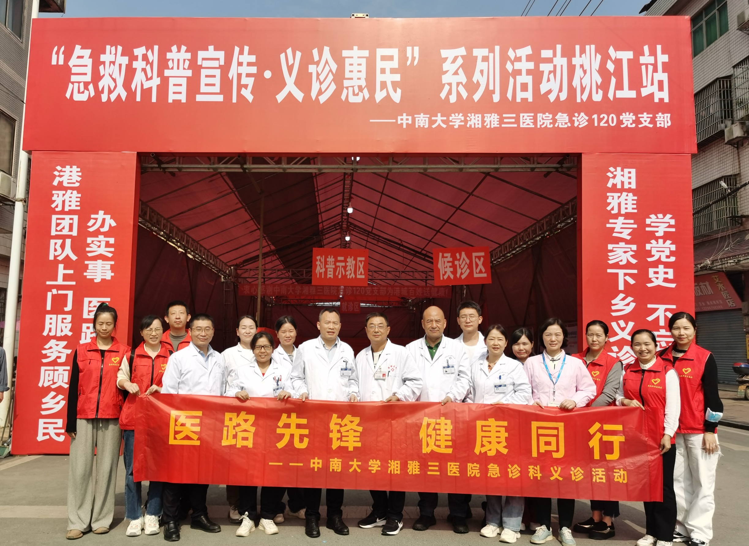 10月29日,中南大学湘雅三医院急诊科副主任(主持工作)刘怀政、张天一教授、急救平台科护士长肖涛、急诊120党支部书记郭美英带领急诊科医护一行20余人走进桃江县灰山港镇,开展“医路先锋,健康同行”主题义诊和急救科普公益活动。此次活动旨在推动党建与医疗服务深度融合,加强与基层医疗单位的沟通交流。