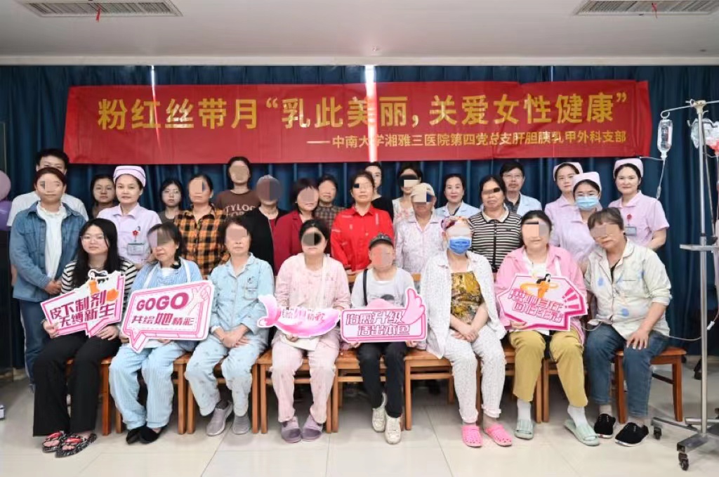 每年10月是“世界乳腺癌防治月”,又被称为“粉红丝带月”。为了向患者传达“及早预防,及早发现,及早治疗”的理念,10月30日,中南大学湘雅三医院乳甲外科开展“关注女性健康,共绘‘她’精彩”乳腺癌相关知识科普,通过“医护患”深入沟通,提高患者对乳腺疾病规范化诊疗的认知,营造更具获得感、幸福感、安全感的就医氛围,助力更多乳腺癌患者实现从身体到心理、再到社会功能的治愈。参与此次活动的人数达40余人。