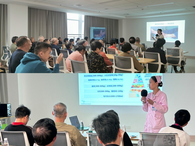 王芳副教授和李霞护士长为“糖友们”准备了两场生动有趣的健康讲座。王芳从糖尿病并发症的危害、分类、筛查、预防等方面进行了深入浅出的阐述,帮助患者了解管理好糖尿病的重要性,以及如何有效地预防糖尿病并发症。李霞从糖尿病饮食着手,用大量的图片详细形象地告诉患者一日三餐如何吃。偌大的教室座无虚席,“糖友们”全神贯注地听着专家们的讲座,并积极互动。课后,何红晖副教授,王芳副教授,袁晶晶主治医生为所有参加健康讲座的糖友们提供健康咨询和指导,耐心细致地给每位患者答疑解惑。“糖友们”纷纷表示课程精彩纷呈,获益良多,同时也希望以后能经常有机会参加这样的科普讲座。来自天心区的李阿姨表示,这次活动非常的有意义,实实在在地为“糖友们”提供帮助,虽大老远赶过来,但非常值得。活动在相机记录下医患和谐的温馨画面后正式结束,然而内分泌科为“糖友们”谋健康的脚步将永不停歇。