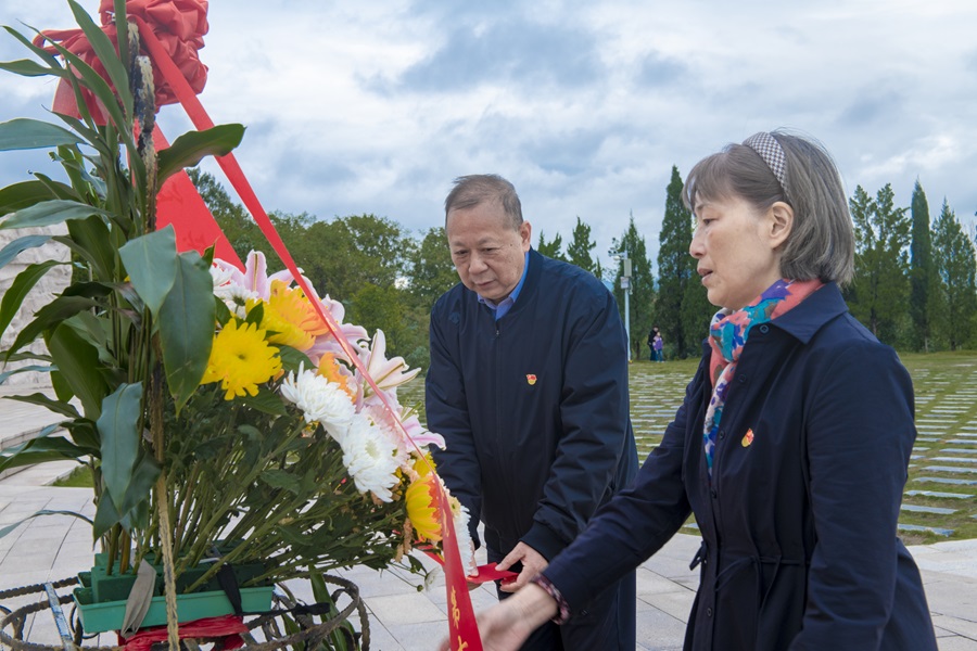 “青山埋忠骨,翠柏勉英雄”。参观湘江战役纪念馆后,全体党员来到“红军魂”雕塑前的凭吊广场举行缅怀仪式,通过向红军烈士敬献花篮、行三鞠躬礼,重温入党誓词等活动,深切悼念英勇献身的革命烈士,赓续共产党人的精神血脉。中南大学湘雅名医黄飞舟、沈守荣仔细整理花蓝上的缎带,并深深地鞠躬,表达新湘雅白衣战士对红军烈士的缅怀之情。