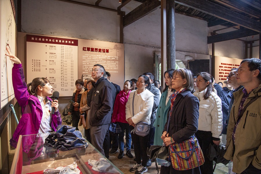 在兴安县三官堂,大家通过阅读相关宣传资料和现场老师讲解,知晓了界首渡口在红军长征中的重要地位。红军1934年11月27日占领界首后,三官堂成为了红军临时指挥部,在当地群众支持下,用木船、木板、毛竹等在界首渡口上架设多座浮桥,并多次将被敌方飞机炸毁的浮桥修复,保证中央首脑机关所在的军委第一、第二纵队11月30日顺利渡过湘江,保证了毛泽东、周恩来、朱德、张闻天等中央领导安全渡江。