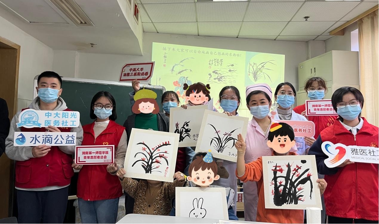 墨韵童趣,传承国粹,童心与水墨的相遇,无处不彰显孩子本性的率真与质朴。本次国画病房课堂由医务社工与志愿者合力联动,共同为住院孩子们提供了多元化服务,让传统国画走进孩子们的心中,激发孩子们对国画的兴趣和热爱,在病房营造了浓厚的学习氛围。今后,中南大学湘雅三医院团委、医务社工与志愿服务指导中心将继续秉承“青春引航 奋斗同行 汇聚爱心 播散阳光”的理念,不断创新“医-社-志”服务模式,满足患者多层次的服务需求,改善广大患者的就医体验,为推动医院人文关怀体系建设和高质量发展贡献青春力量。