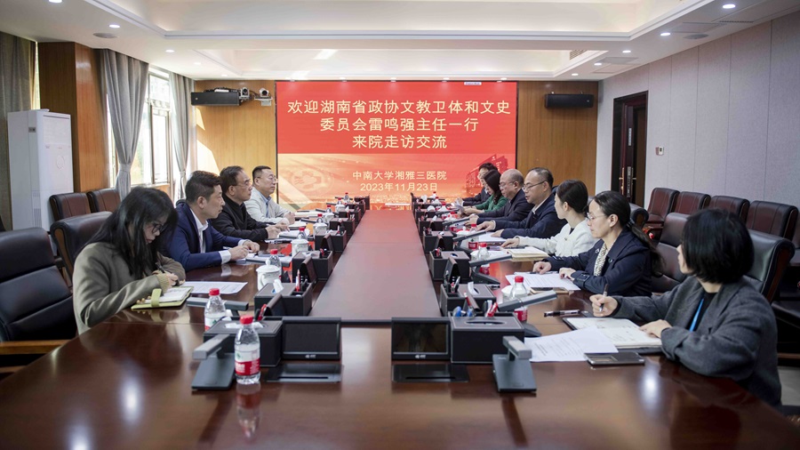 11月23日,湖南省政协常委、省政协文教卫体和文史委员会主任雷鸣强一行5人到中南大学湘雅三医院走访交流。医院党委副书记、院长江泓,党委副书记、纪委书记张劲强,省政协委员蔡菁菁、王芬、姚晨姣及相关职能部门负责人参加。