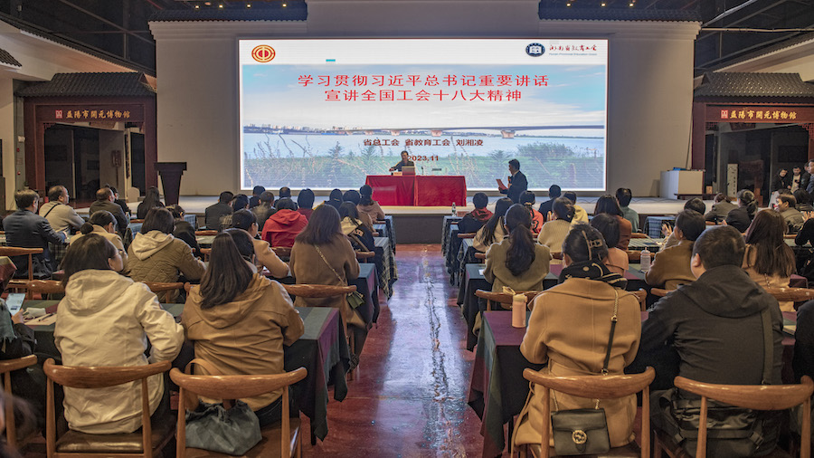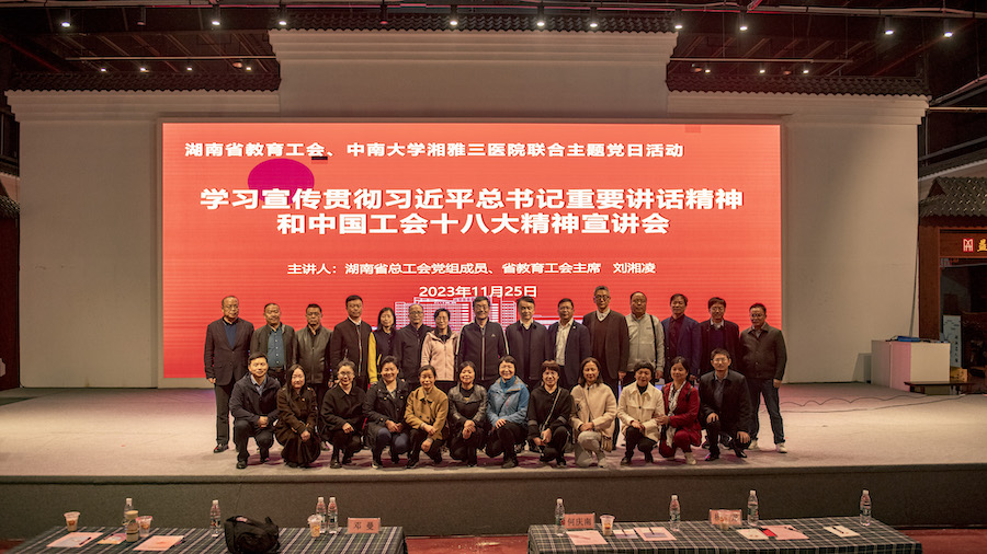 为深入学习贯彻习近平总书记重要讲话精神,贯彻落实中国工会十八大精神,进一步加强工会干部队伍建设,提升中南大学湘雅三医院工会干部履职能力,11月25日,湖南省教育工会、中南大学湘雅三医院在益阳市天意木国文化博物馆联合开展工会干部主题党日活动。湖南省总工会党组成员、省教育工会主席刘湘凌,湖南省教育工会副主席邓曼、中南大学湘雅三医院党委书记何庆南出席活动,省教育工会干部、中南大学湘雅三医院工会干部100余人参加了活动,活动仪式由湘雅三医院党委副书记、工会主席杨飞龙主持。