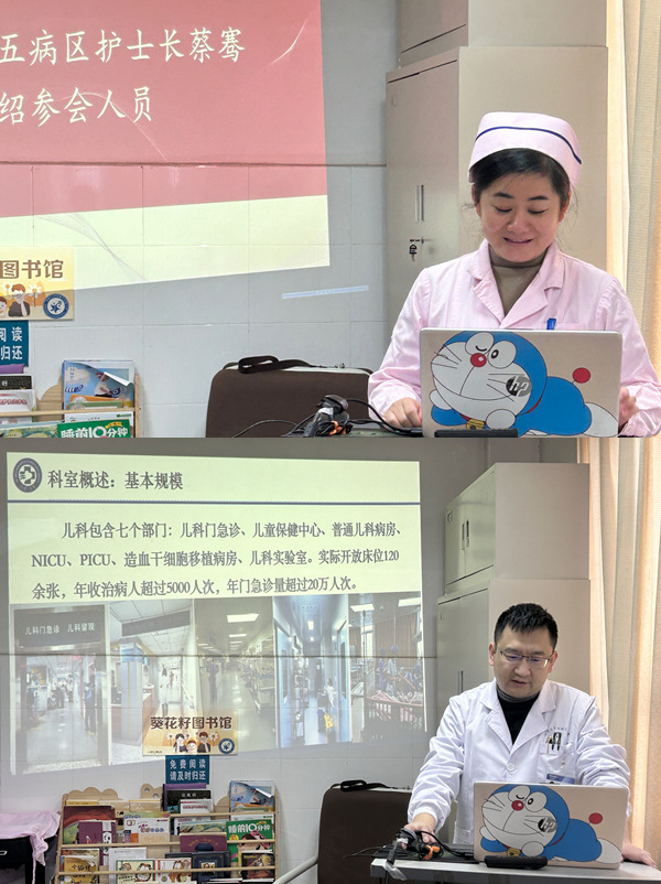 驻点医务社工罗咸宁从个案服务、团体小组、病房活动、资源链接等方面介绍了近年来驻点儿科医务社工服务开展情况,向参访团展示了医务社工在给予儿童大病患儿支持,帮助其家庭增能方面发挥的积极作用。