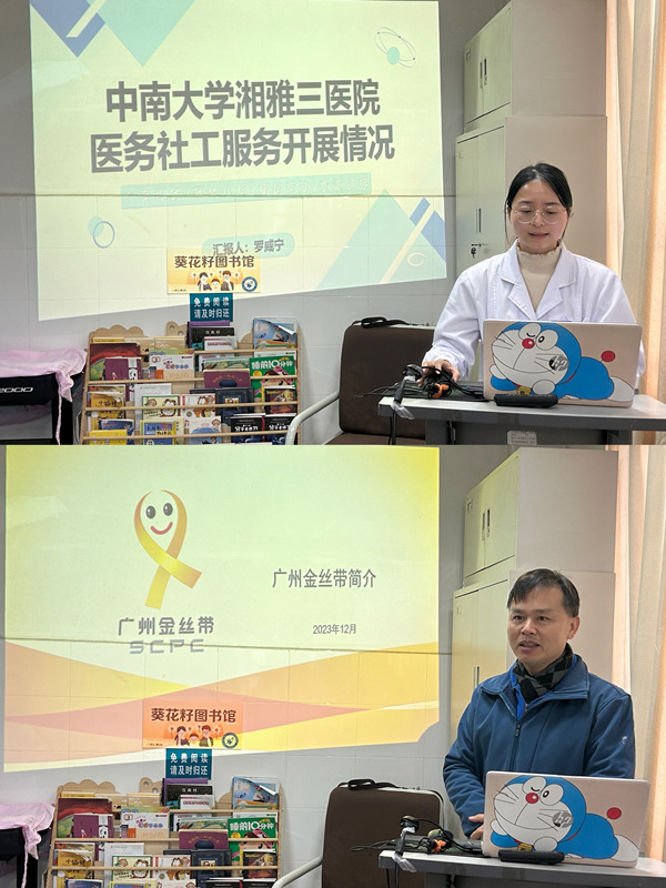 12月1日下午,广州市金丝带特殊儿童家长互助中心总干事罗志勇和香港鲍广桓儿童慈善基金主席、国际儿童癌症协会亚洲区主管鲍洁钧一行,来到中南大学湘雅三医院就儿科医务社工服务与慈善救助工作进行交流,中南大学湘雅三医院儿科联合团委、医务社工与志愿服务指导中心组织接待了参访团一行,并安排了实地参观和座谈交流。医院团委书记、医务社工指导中心主任程海威,儿科主任杨明华教授,院团委委员戴萍萍,驻点医务社工及儿科医务人员就服务项目合作等相关事宜在儿科五病区示教室进行了深入沟通交流。会议由儿科五病区护士长蔡骞主持。