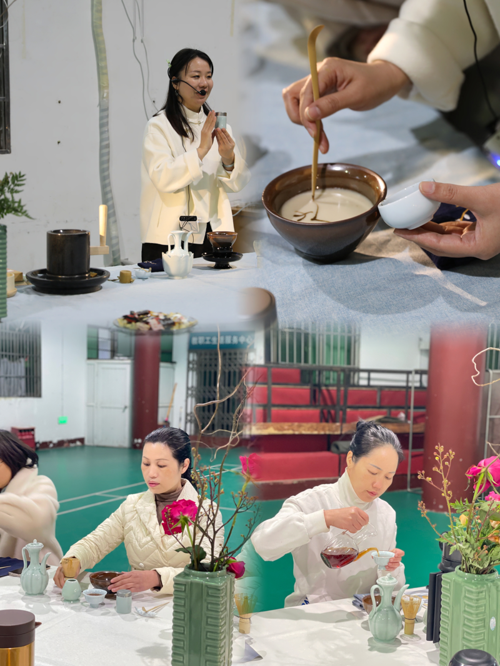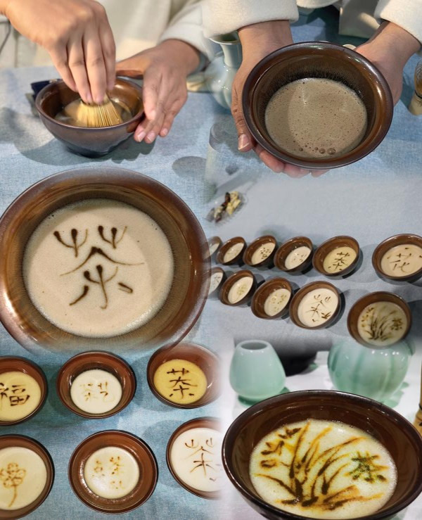 茶艺课程的主讲老师茶朵介绍点茶器具十二先生,它出自宋代审安老人所著《茶具图赞》,用传统的白描画法画了十二件茶具图形,称之为”十二先生“,按宋时官制冠以职称、字、雅号等。茶朵老师行云流水般地表演了宋代点茶的制作过程,她用细腻的手法将茶叶精心挑选、烘焙、研磨、击拂,七汤后最终呈现出了一杯香飘四溢、色香味俱佳的宋茶。随着茶朵老师精湛的技艺展现,学员们全神贯注地欣赏并跟随老师的每一个动作,一盏盏韵味独特的宋茶被精心制作出来。最后体验一下以茶为墨,在茶汤里面画画,大家把茶汤排成一片,比一比久久不散的茶沫,犹如艺术品般令人陶醉。
