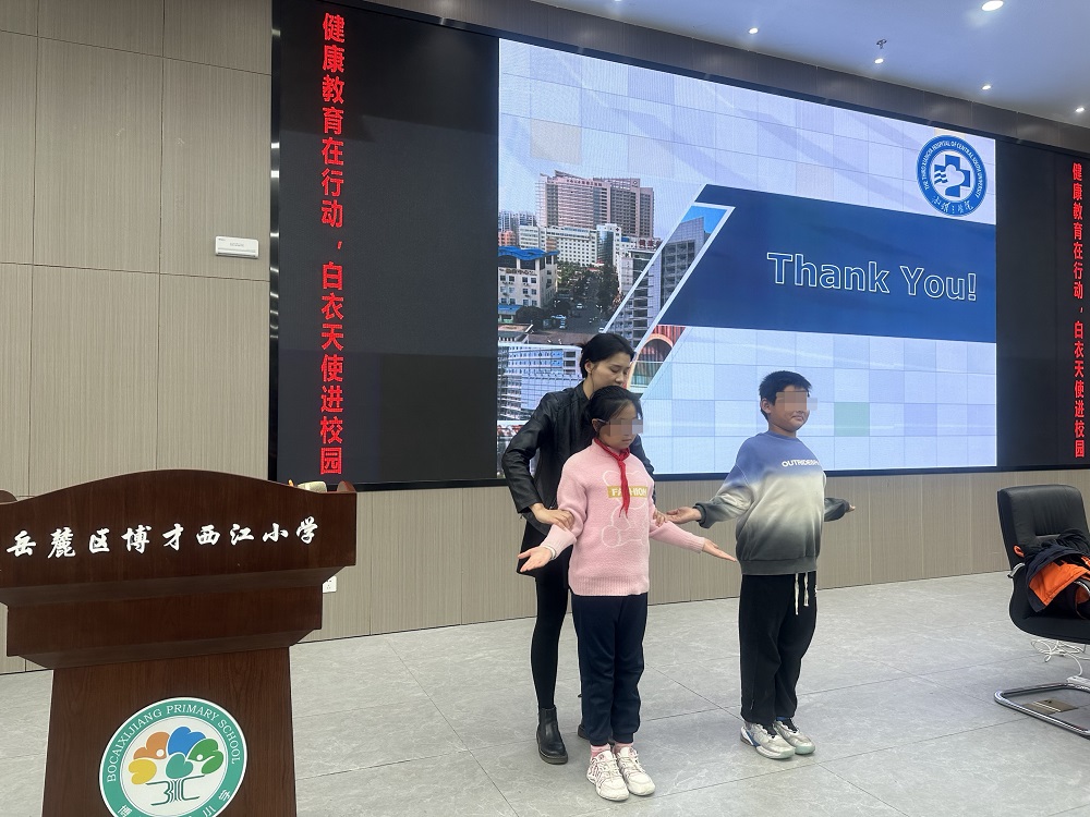 为提高青少年脊柱健康意识,改善姿势健康水平,预防脊柱侧弯的发生,12月8日下午,中南大学湘雅三医院康复医学科治疗师长范帅和康复治疗师张秀兰受邀走进博才西江小学,为该校4-6年级同学进行了生动有趣的青少年特发性脊柱侧凸科普演讲。