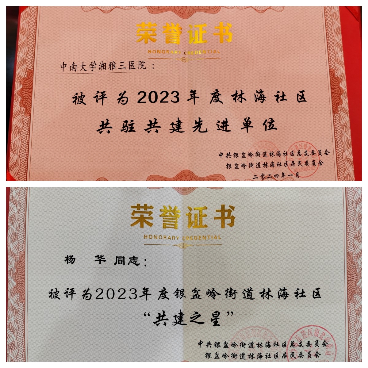 1月16日,中南大学湘雅三医院离退休党总支与林海社区党总支在社区三楼会议厅举行2023年度总结表彰会暨区域化党建共建活动。会上,医院获得“优秀共建单位”,离退休党总支书记杨华获“共建之星”,巫爱琳、刘亚洲、荣庆国获“优秀栋长”等荣誉。