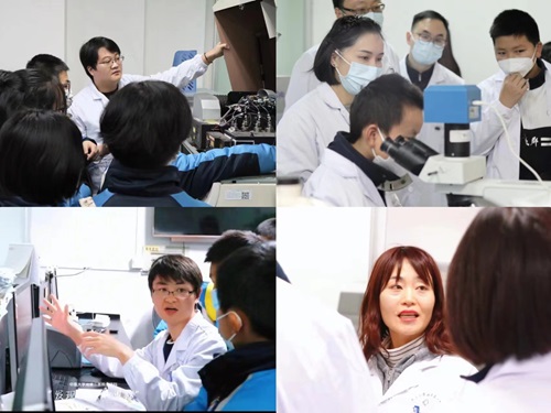 在血液内科实验室,同学们分为四组,先后到骨髓形态室、细胞遗传室、流式细胞室和分子生物室学习。在骨髓形态室,带教老师细致地讲解了血液细胞的发育过程,各种类型血细胞的形态和作用,老师们还带着同学们在显微镜下认识了血液细胞。在流式细胞室,同学们学习了流式细胞仪检测免疫细胞的原理,不同免疫细胞的功能和作用,老师们让孩子们通过观察机器内部,第一次认识到真正的精密科学仪器。在细胞遗传室,以前只听说过染色体名字的同学们看到了全自动显微镜采集细胞染色体图像的全过程,在这里,带教老师准备了答题卡,让同学们完成同源染色体配对。而在分子生物室,同学们则穿上白大褂,参观了先进的高通量基因测序设备,通过教学视频学习了PCR实验原理,还动手体验了加样枪,建立了“微量体系”的概念。