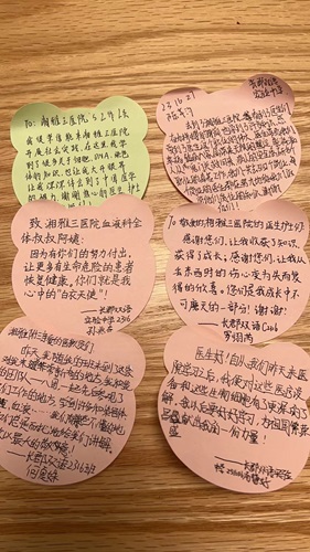 活动结束之后,血液内科收到了同学写下的热情洋溢的留言贴纸。通过本次科普活动,同学们不但收获了医学知识,见识了平时难得一见的医学实验装备,还了解到了造血干细胞挽救生命的方式,让同学们对生命的价值有了新的认识。