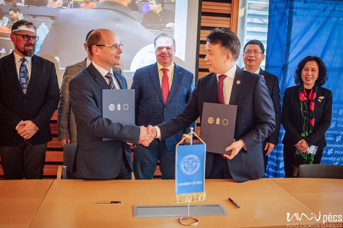 1月18日,何庆南一行访问匈牙利佩奇大学,与佩奇大学常务副校长József Betlehem、国际中心主任István Tarrósy等见面会谈。双方就今后的合作方向达成共识,并签署合作协议,协议内容涵盖学者互访交流、医学生联合培养、科学研究和国际项目合作等多个方面。
