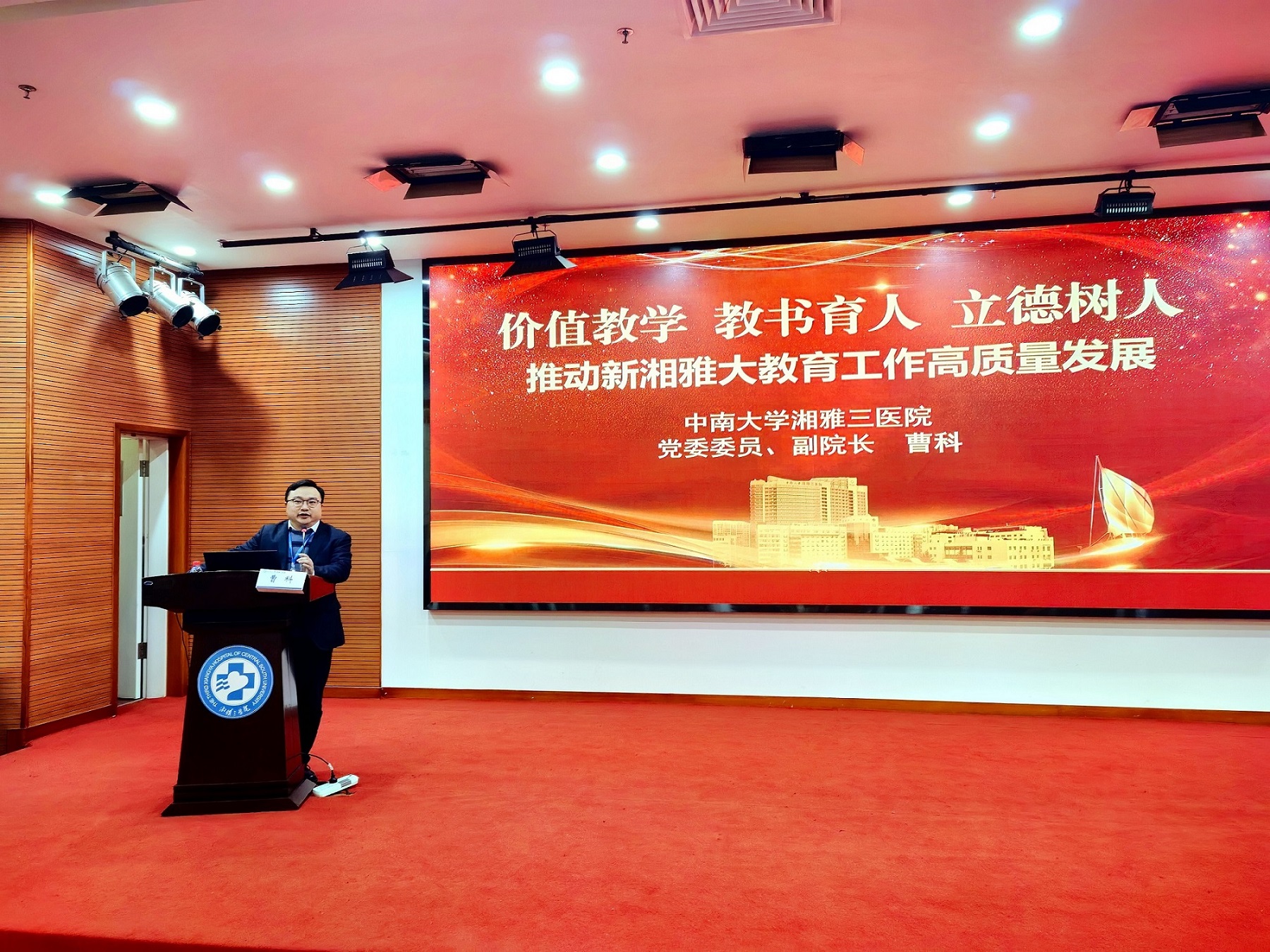 培训会上,曹科对来院培训的学员表示热烈的欢迎,并带来了以《价值教学、教书育人、立德树人,推动新湘雅打教育工作高质量发展》为主题的精彩授课。他从百年湘雅的历史开始,到新湘雅大教育高质量发展新航程,介绍了新湘雅医学教育“1234”行动计划,鼓励各位进修学员回归自我、不忘初心、持续奋斗,融入新湘雅大家庭,用“爱”的信念,树立“病人为中心”理念,恪守规范,认真培训,并祝愿学员们一切顺利,圆满完成进修学习任务。