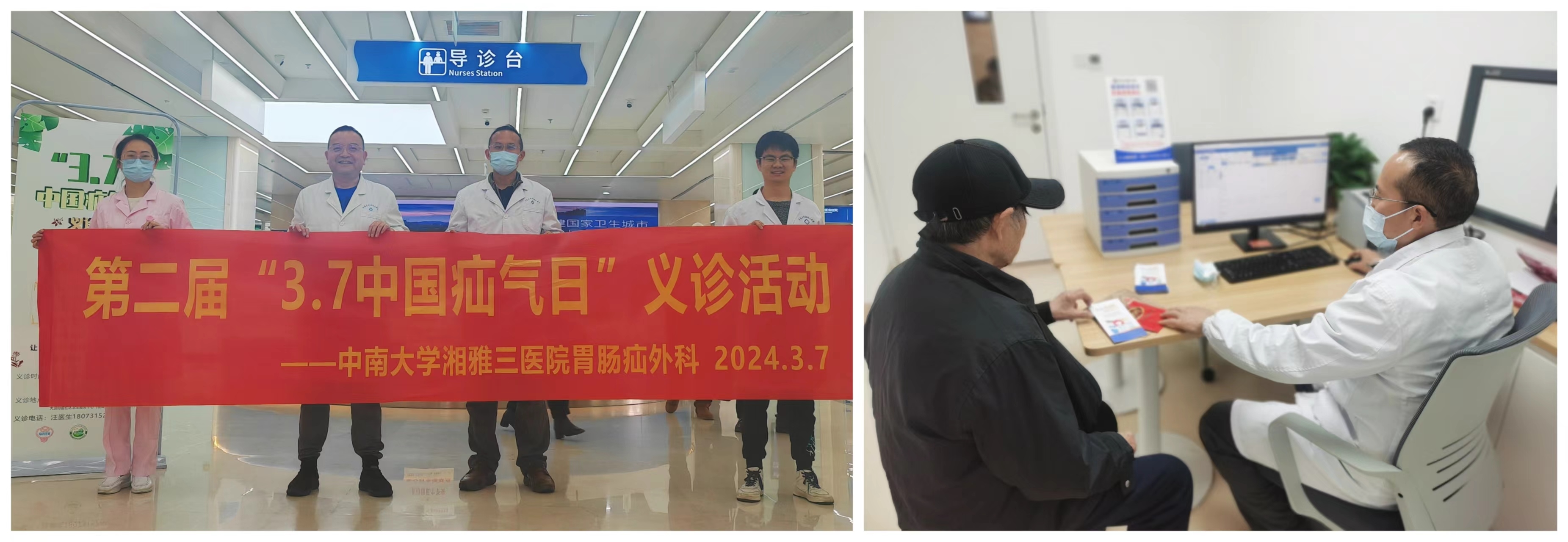 义诊在三个地点同时进行。其中,湘雅三医院副院长朱利勇携刘海教授、任祖海教授驻守新门诊大本营,为疝疾病患者进行健康查体、治疗指导、答疑解惑。为提升疝疾病科普力度,让更多群众知晓疝、了解疝,任祖海教授接受长沙政法频道记者采访时,结合临床案例,用诙谐生动的语句为大家解释了什么是疝、疝气高发人群、疝气的预防与治疗。他呼吁大家发现腹股沟有突起包块并伴有疼痛时,应尽早就医治疗,避免发生疝嵌顿,导致肠绞窄、肠坏死,甚至危及生命。