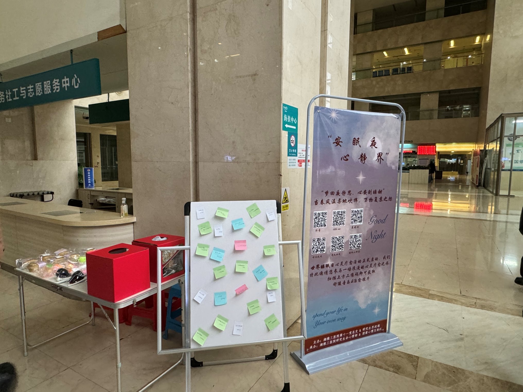 研究生会心理部成员在外科楼一楼精心准备了活动现场,为参与者提供了缓解压力、改善睡眠音乐和视频,并准备了缓解压力的小贴纸,上面写满了各种祝福语。