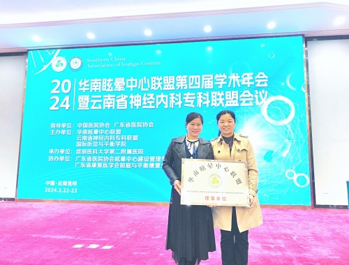 3月22日至23日,2024华南眩晕中心联盟第四届学术年会在四季如春的美丽昆明隆重举行,大会汇集了来自全国各地的专家学者以及业界领袖,共同探讨眩晕疾病的诊疗技术、最新研究成果、前庭康复和未来发展趋势。经过严格筛选和评审,中南大学湘雅三医院耳鼻咽喉头颈外科眩晕中心,不负众望获得“华南眩晕中心联盟理事单位”,李维副教授代表科室上台领取授牌。这是全国大会对耳鼻咽喉头颈外科眩晕中心多年来在眩晕疾病的诊治、前庭康复、研究成果、高质量服务水平等方面取得显著成绩的表现和贡献的高度评价和认可。