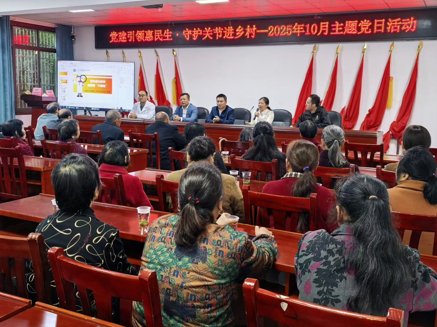 在胜和村党群服务中心,骨科党支部副书记郭强和党员医生彭平分别为村民们带来关于骨质疏松和手健康知识科普讲座。有的老乡听完讲座又前来咨询,纷纷夸赞新湘雅的医生们“有水平”。科普讲座之后,党员与村民们举行座谈会,并开展结对服务,党员们承诺根据村民的需求,后续可进一步提供健康咨询、诊疗咨询等健康服务。党员们与村“两委”展开座谈,围绕“基层医疗如何精准对接群众需求”“党员如何助力乡村振兴”等话题深入交流,梳理帮扶建议,推动党建与乡村发展需求精准对接。