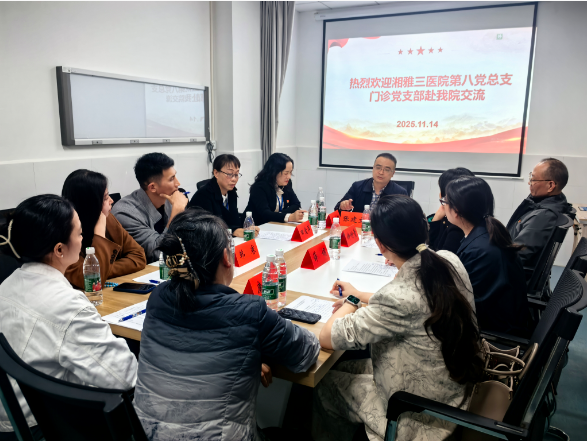 随后,双方召开了亲切热烈的座谈交流会。会议由湘西州人民医院张建文副院长主持,他强调了院际交流对于推动双方共同发展的重要性,并期待以党建为引领,在学科建设、人才培养、管理优化等方面开展更深层次的合作。第八党总支书记罗忠华在发言中深情表示,此次交流不仅是党建工作的相互学习,更是业务实践的深度碰撞。他希望以党支部共建为桥梁,探索党建与业务深度融合的新路径、新模式,将党的政治优势、组织优势转化为推动医院高质量发展的强大动力。门诊综合党支部书记、病友服务中心主任钟竹青重点分享了其部门践行“始于需求,忠于满意”服务理念的实践经验。薛娟副主任、康丹护士长、韩赛护士长、罗佩佩副护士长等也分别结合门诊管理、护理服务、日间手术与复合手术室运营等具体业务,分享了实践经验与思考。湘西州人民医院的黄娟副主任、田爱萍副主任、阙继红书记等也就各自领域的党建与业务工作亮点、面临的挑战及对策进行了坦诚交流。