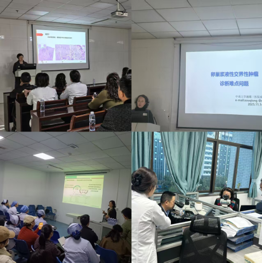 另外,病理科党支部为湘西州人民医院病理科的全体同仁带来了两场精彩的学术盛宴,初令主任做了“多维诊断体系助力感染相关病变诊断”的讲座,邹琼副主任针对“卵巢浆液性交界性肿瘤诊断难点问题”进行了详细解读,陈倩副主任及付华老师在科内进行多头阅片指导。接着,初令主任与湘西州人民医院副院长张建文、病理科主任彭英霞就“医院层面如何托举病理科全方位发展”这一议题做了较深度的交流,初令主任表示:湘雅三医院与湘西州人民医院历来关系紧密,亲如一家,今后会继续不遗余力协助病理科的发展。最后,双方围绕如何以党建为抓手破解业务难题、如何激发党员在关键岗位的先锋模范作用、如何构建更高效的跨部门协作机制等议题展开了充分研讨,相互启发,收获颇丰。