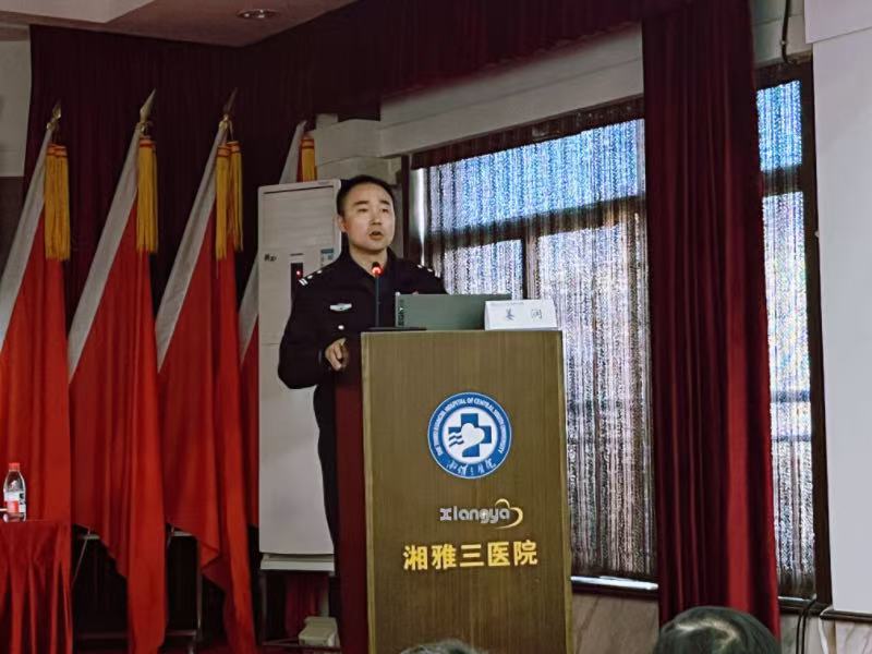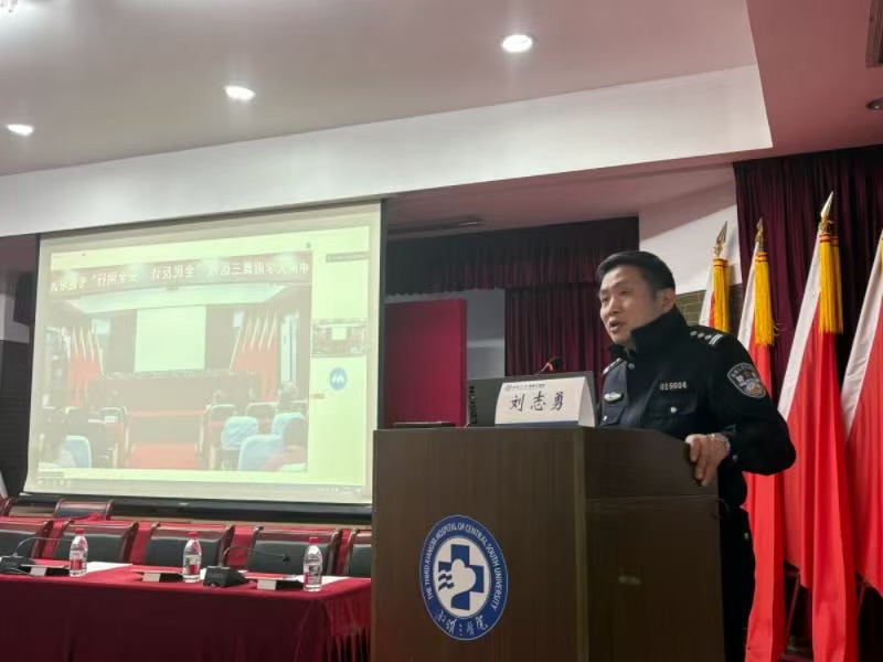 为切实提升医院职工的电信网络诈骗防范意识和应对能力,筑牢“平安医院”安全防线,2025年11月27日下午,长沙市湘江新区公安局银盆岭派出所所长刘志勇、副所长姜润应邀走进中南大学湘雅三医院,开展反电诈专题授课。活动由医院党委委员、副院长欧阳文主持,医院党委书记何庆南、院长江泓及全体医院院领导、各职能部门及临床科室负责人、科室安全员参会,驻院民警刘斌警官、贺云晖警官共同出席。