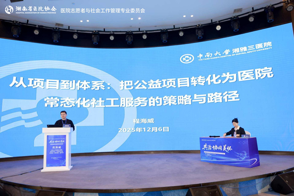 12月5日至7日,由湖南省医院协会医院志愿者与社会工作管理专业委员会主办,中南大学湘雅医院、湖南省湘雅医学与健康基金会承办的“湖南省医院协会医院志愿者与社会工作管理专业委员会第三届委员会换届大会暨2025年学术会议”在长沙举办,中国医院协会医院社会工作暨志愿服务工作委员会主任委员、上海交通大学医学院附属上海儿童医学中心原党委书记季庆英,湖南省医院协会、中南大学湘雅医院、复旦大学附属华东医院等单位领导专家出席,全省各级医疗机构、社会组织代表参加会议。会议上进行了湖南省医院协会医院志愿者与社会工作管理专业委员会第三届委员会换届,湘雅三医院再次当选为副主委单位。院团委书记、社志办主任程海威在此次会议上做了题为“从项目到体系:把公益项目转化为医院常态化社工服务的策略与路径”的主题分享,获得与会人员一致好评。